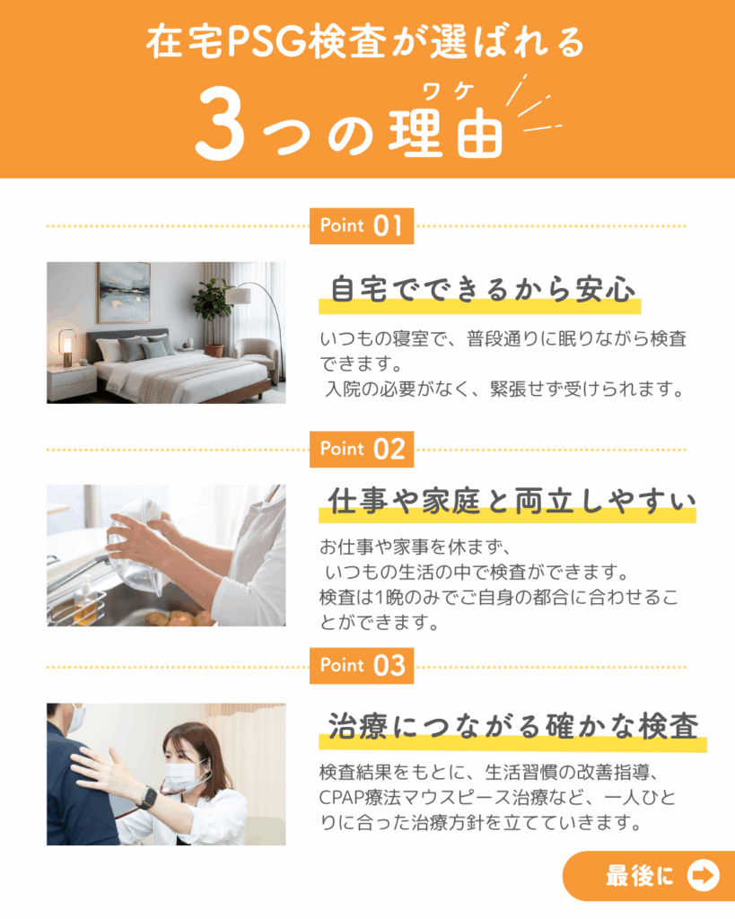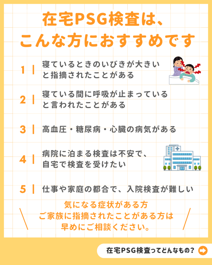 当院では、2025年11月より、入院不要で受けられる「自宅での在宅PSG検査」のサポートを開始しました。