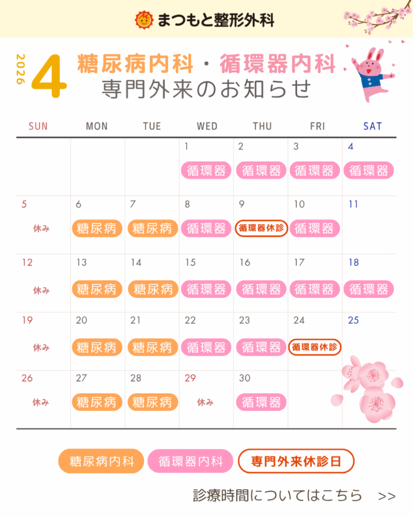 糖尿病内科と循環器内科を併設。高血圧、糖尿病、脂質異常症など生活習慣病を専門とする医師が在籍しており、整形外科と内科の連携した医療のご提供が可能です。複数の医療機関を受診する必要がないように、整形外科と内科のワンストップ診療で患者さまの負担軽減に努めています。