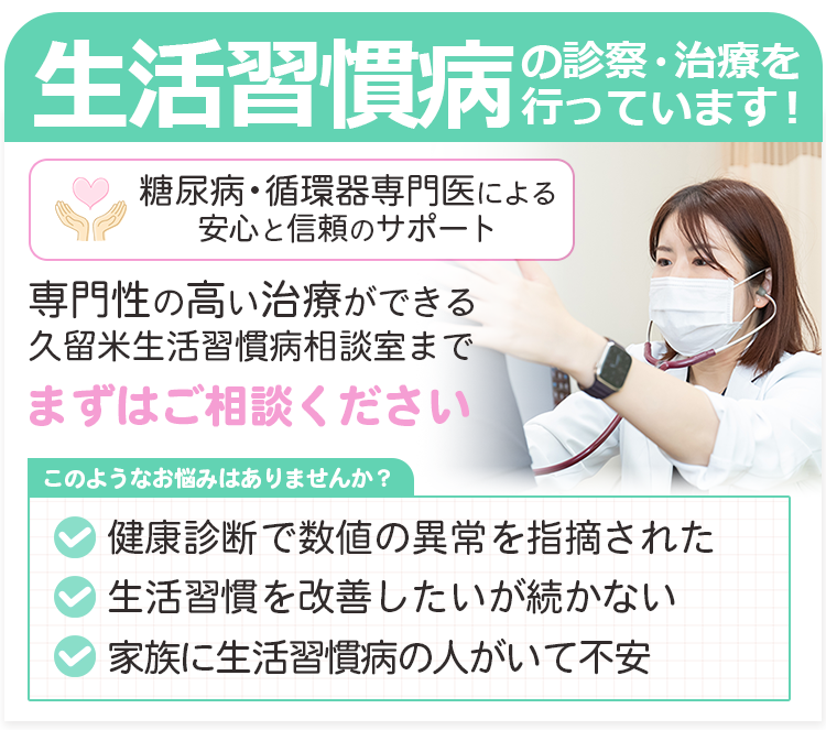 「健康診断で指摘を受けた」「親族に心臓病や脳卒中の人がいる」といった方は、症状が出る前に一度ご相談ください。
