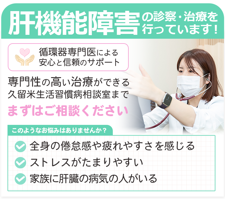 肝機能障害は自覚症状に乏しいため、他の病気の検査や健康診断の際に異常が判明することがほとんどです。