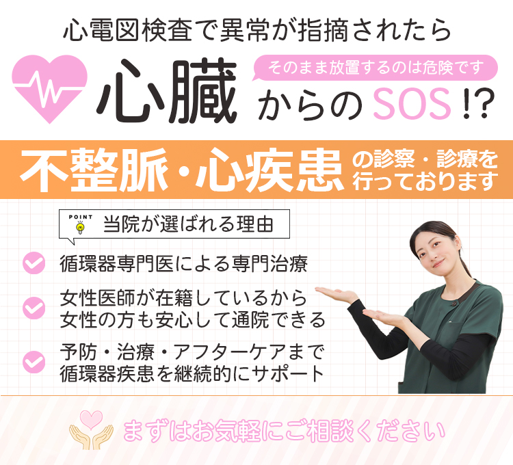 不整脈は自覚症状がなくても、突然死など深刻な状態を招く恐れがあります。心電図検査で精密検査を指摘された場合は、まずは当院にご相談ください。