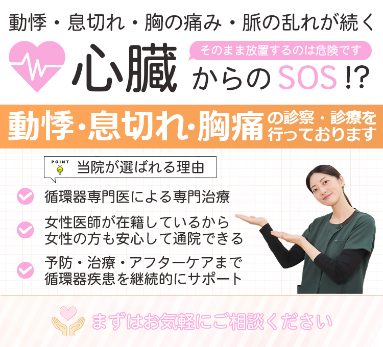 動悸と同時に胸痛を感じたり、呼吸苦を感じる場合は狭心症や心筋梗塞の可能性があります。 また、脈拍が1分間に120以上あるときは動悸だけではなく、息苦しく心不全になることがあります。 当院の循環器内科を受診される方の多くは、ご自身の体に何か深刻な問題が発生しているのではないかという不安や心配を抱えています。 もし「動悸」「息切れ」「胸の痛み」の症状に少しでも心当たりを感じたら、何かが起こる前にお早目に当院にご相談ください。